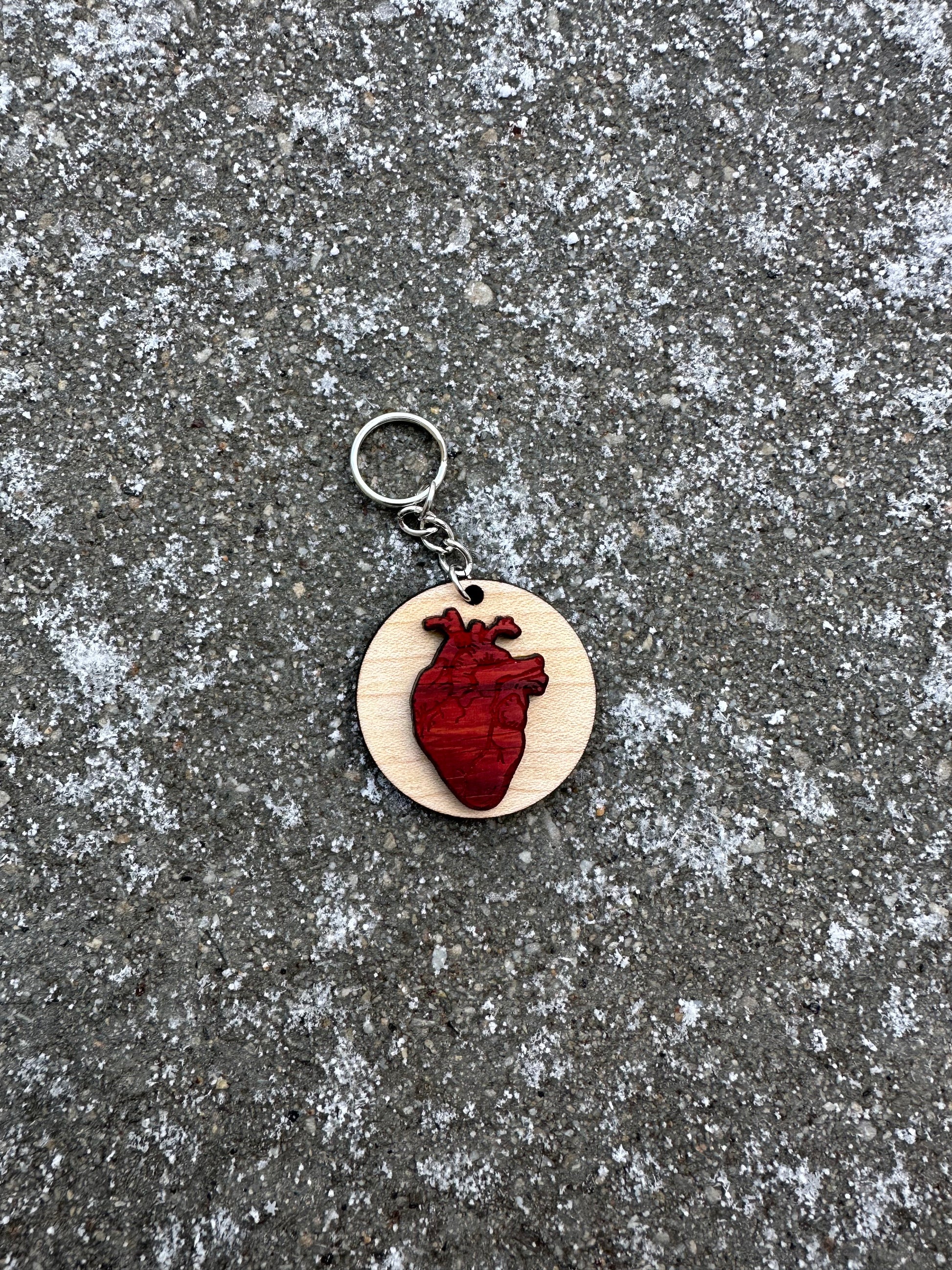 this wooden anatomical heart keychain is crafted entirely from naturally colored wood- no stains, just the rich beauty of real wood. the layers are carefully assembled to create depth, while engraved details add precision. the deep red tones contrast beautifully against the lighter wood backing, making this a bold and eye-catching piece.