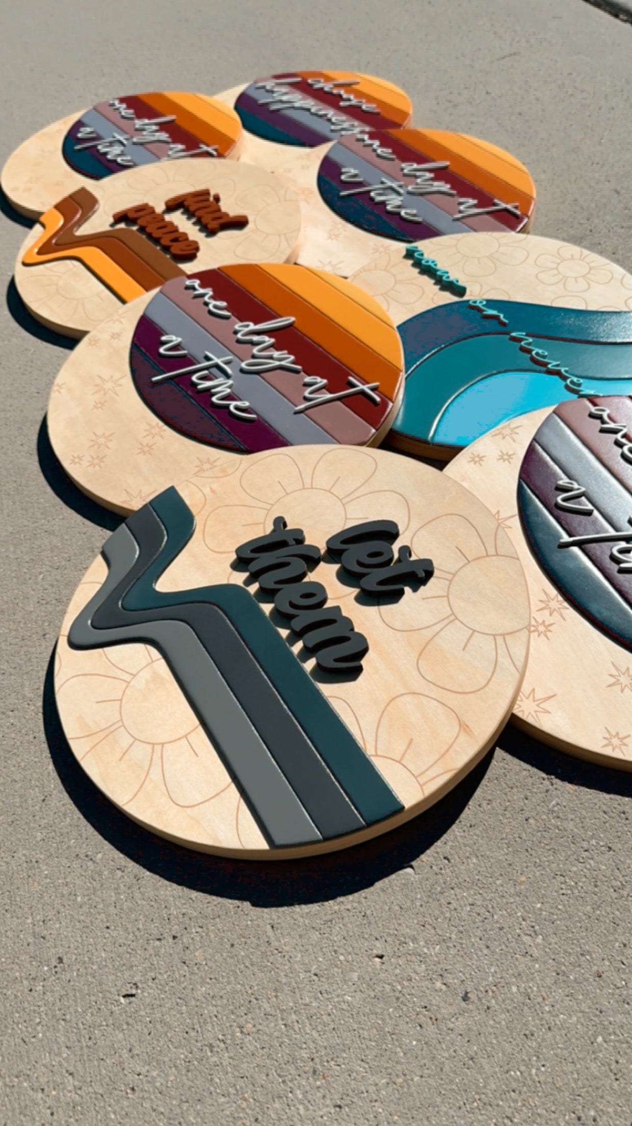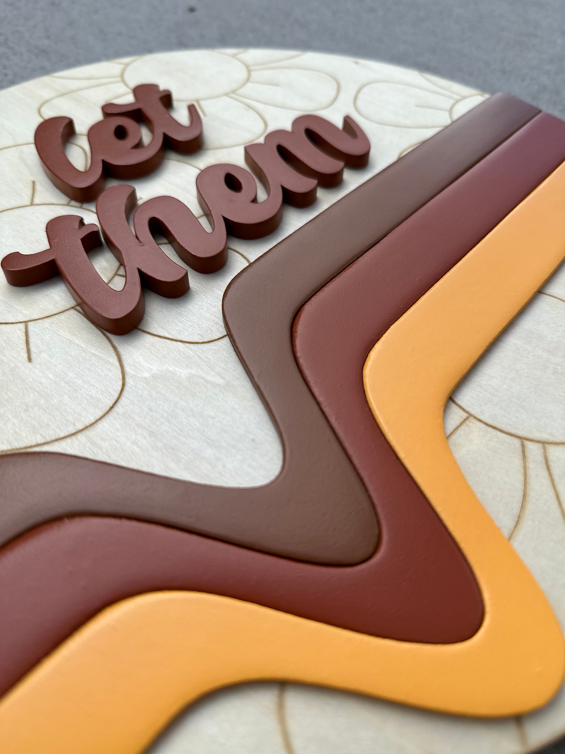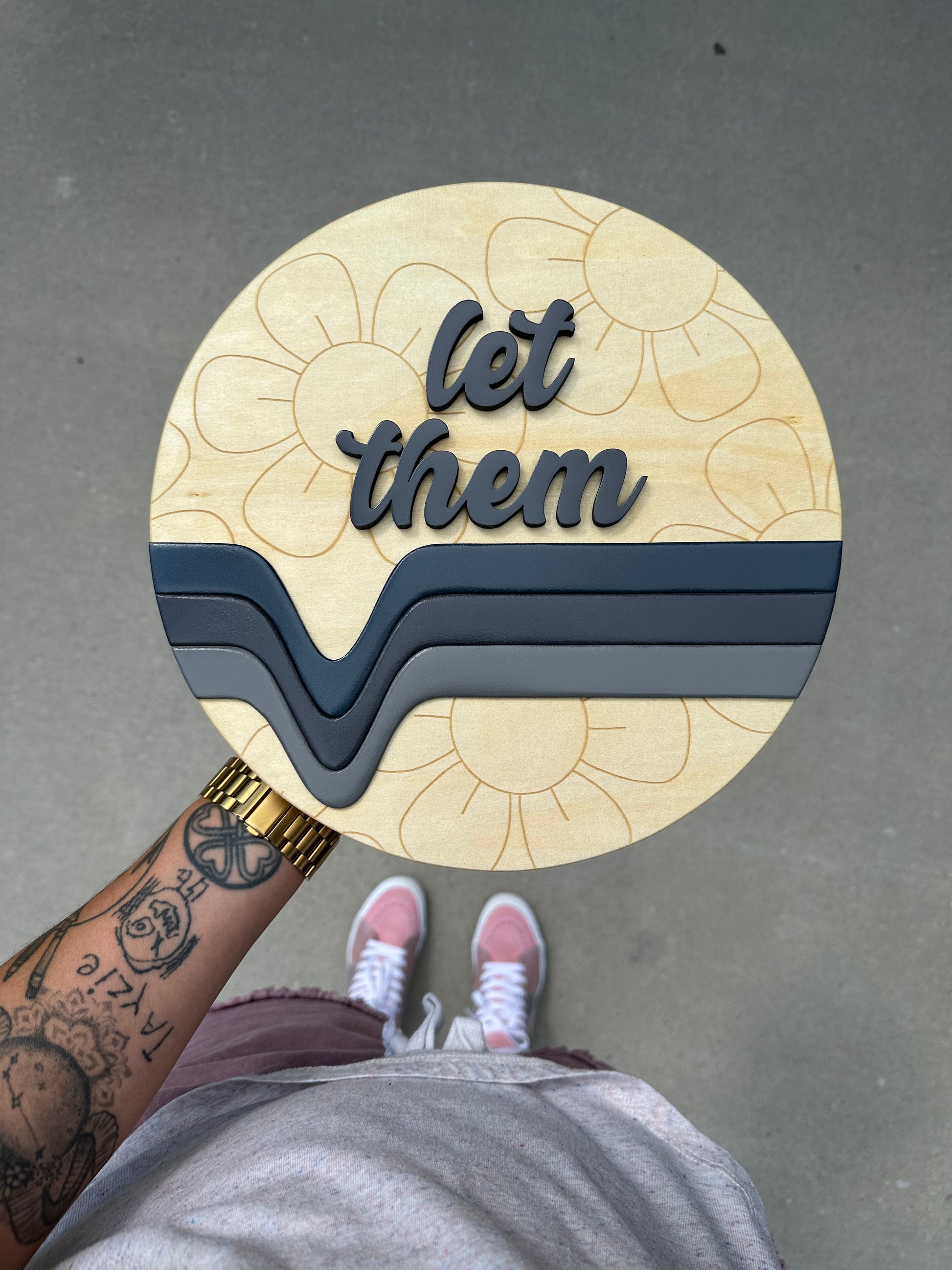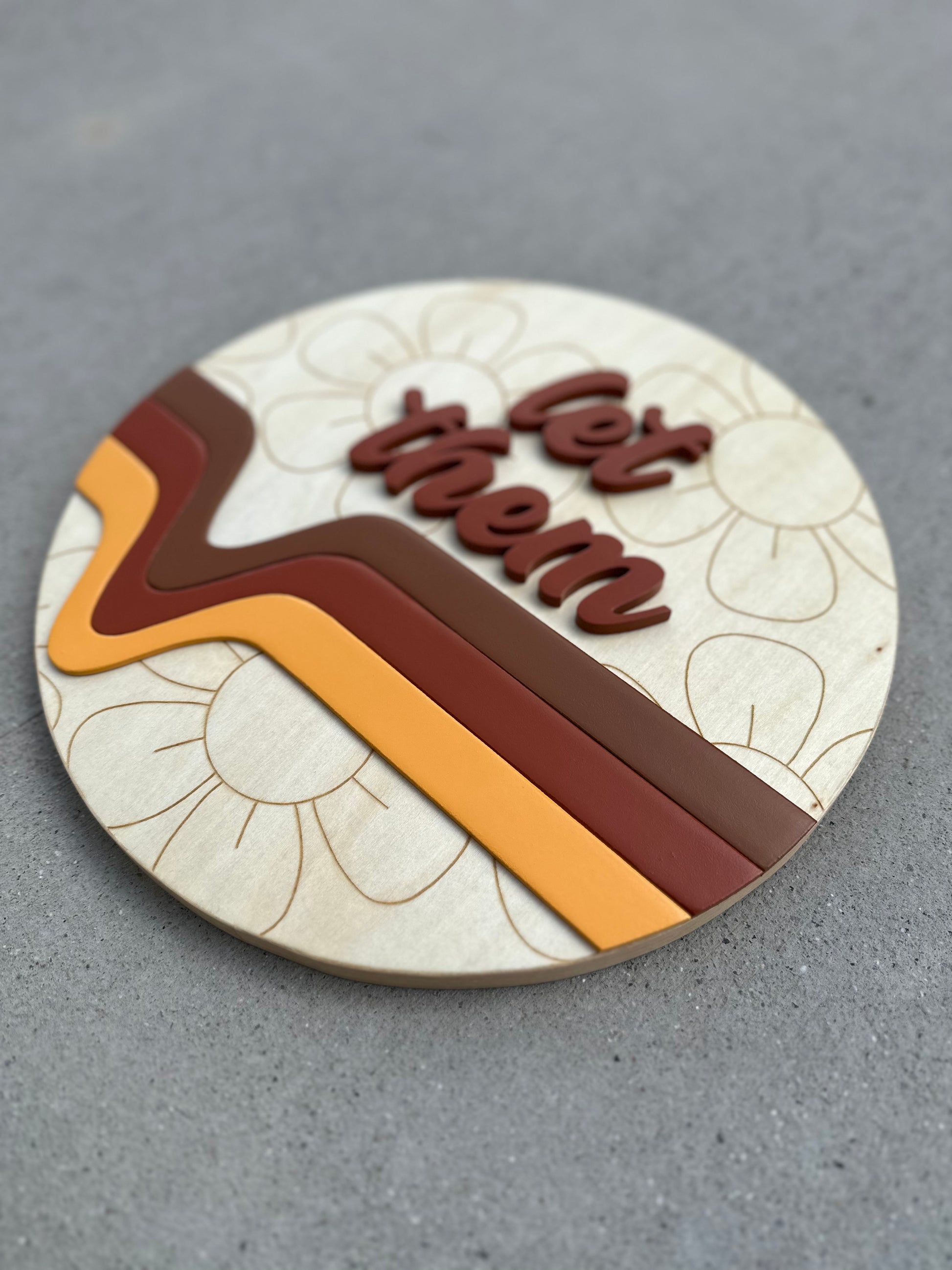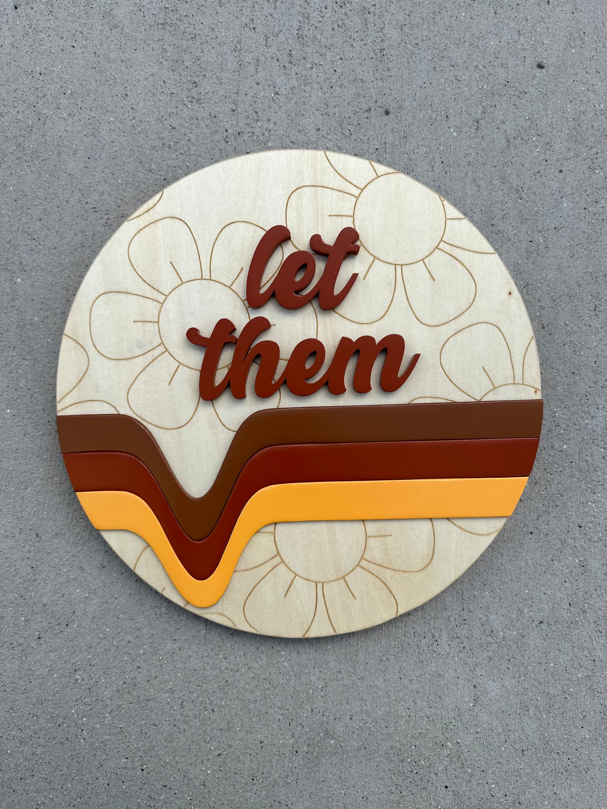 12” round birch sign with flower engravings, 3d retro line design, and 3d “let them”.